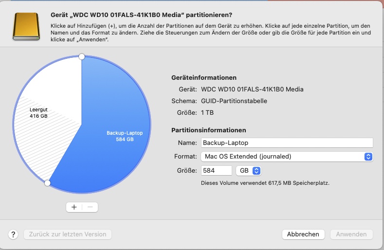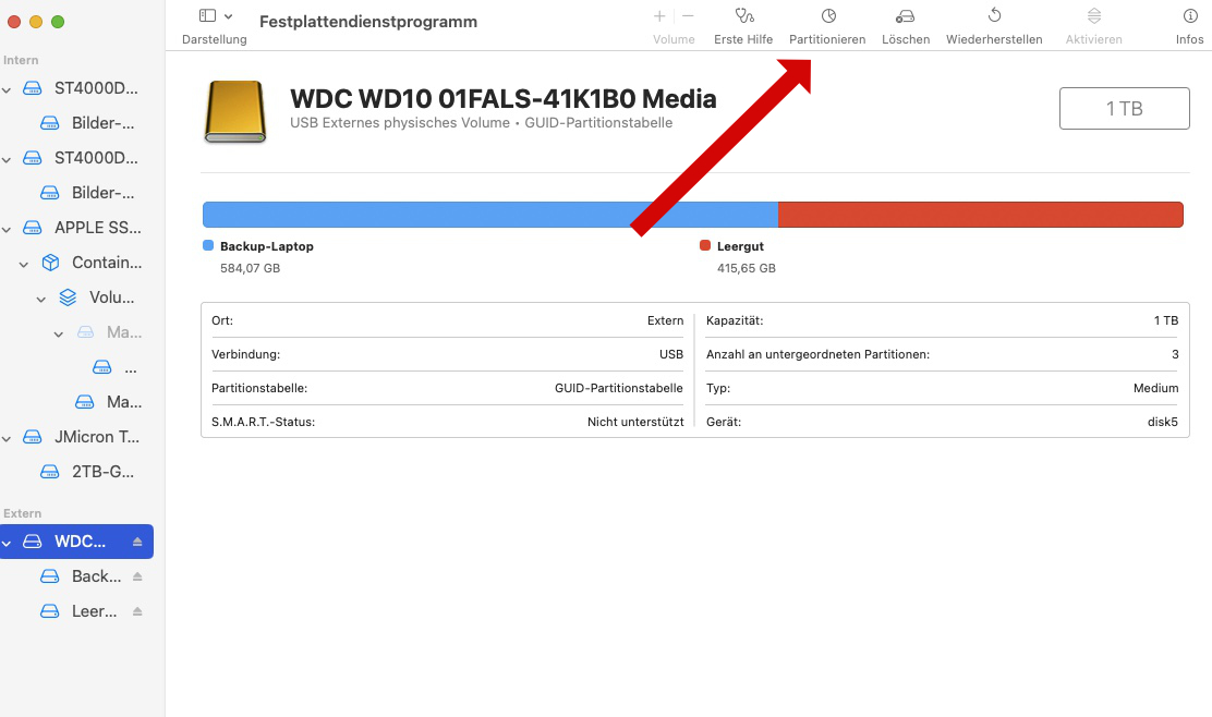 Falls genug freier Platz auf der HD kann mit dem Apple Festplattendienstprogramm eine zweite Partion auf der externen Festplatte errichtet werden. Dazu das Programm öffnen und die gewünschte Festplatte anwählen: